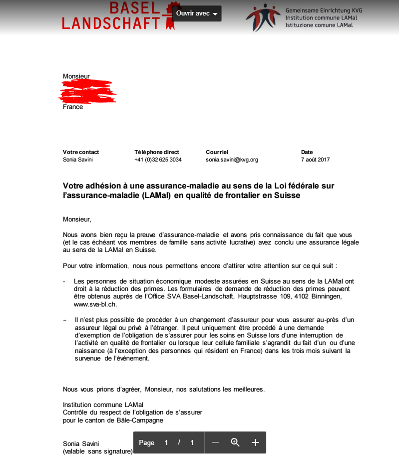 je reviens un peu dans le sujet avec ce document que j’ai recu en envoyant une copie de ma police d’assurance a la LAMAL de Basel Land suite a quelques conseils que j’avais recu sur le forum pour demander si tout était clair concernant mon affiliation en suisse pour fin septembre: