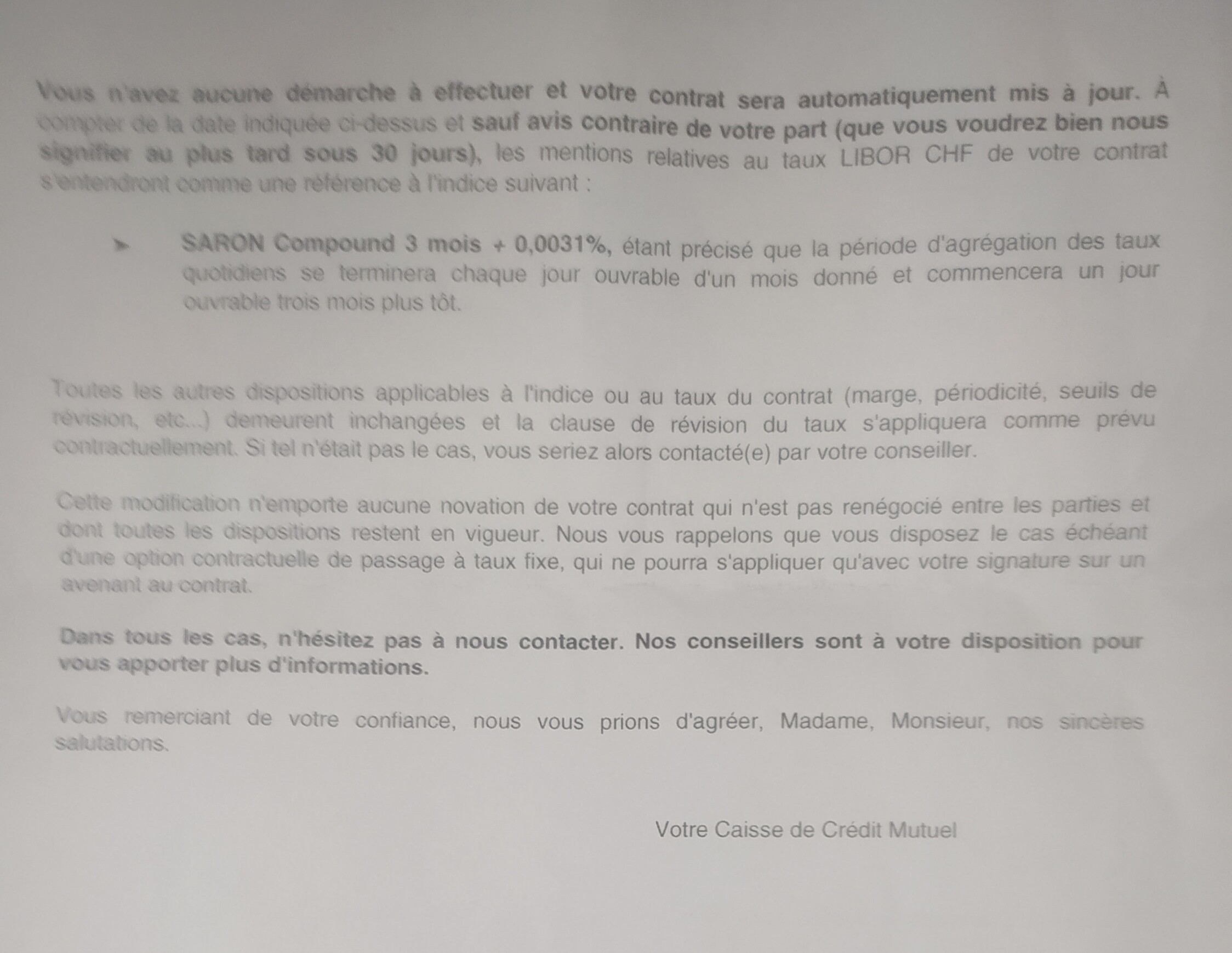 Pour ma part je viens de recevoir aujourd’hui une lettre du CM pour le passage au SARON compound 3 mois + 0,0031%. Je suis perdant par rapport à ce que j’avais avec le libor CHF 3 mois.
