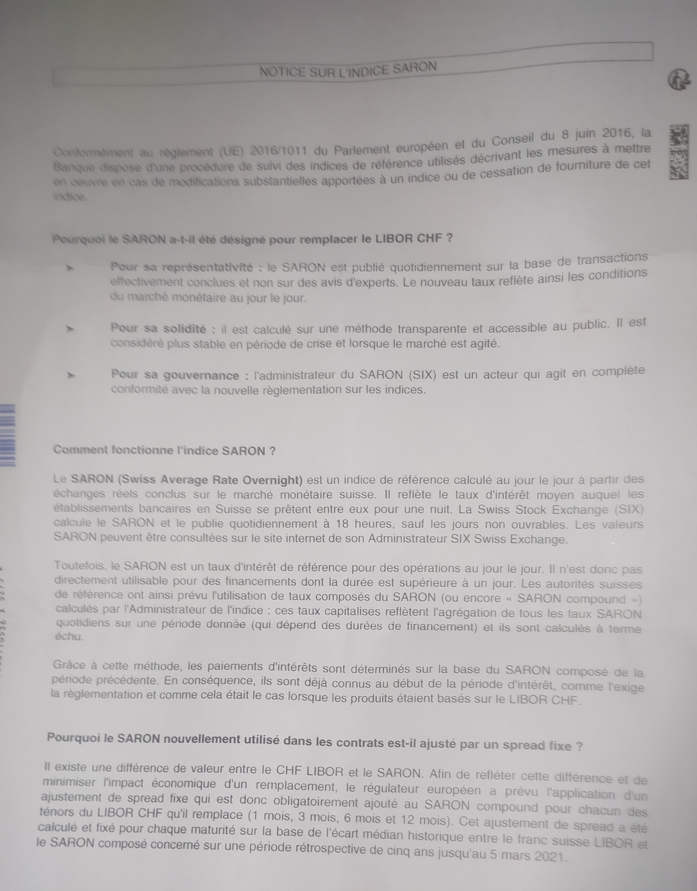 Je pense être perdant car si je comprend bien le SARON est à +0,0031 alors que le libor CHF 3 mois est - 0,7. Ci joint le courrier désolé mon tel est HS et ne fait pas de belles